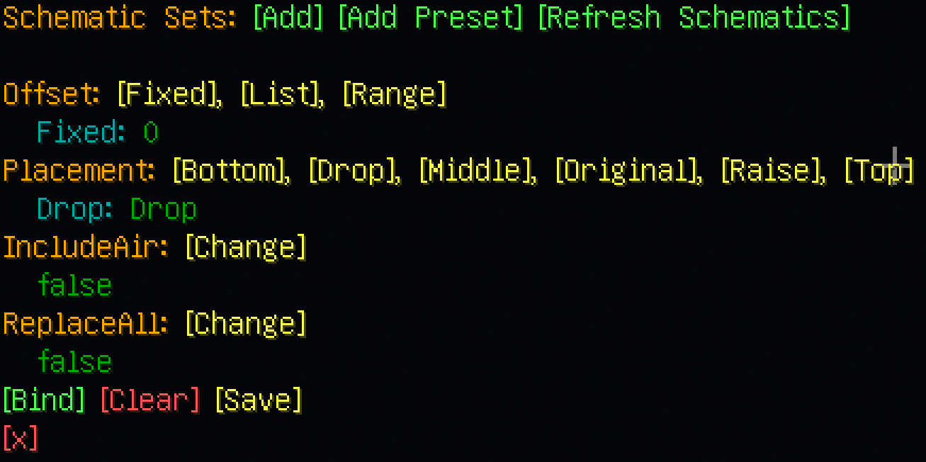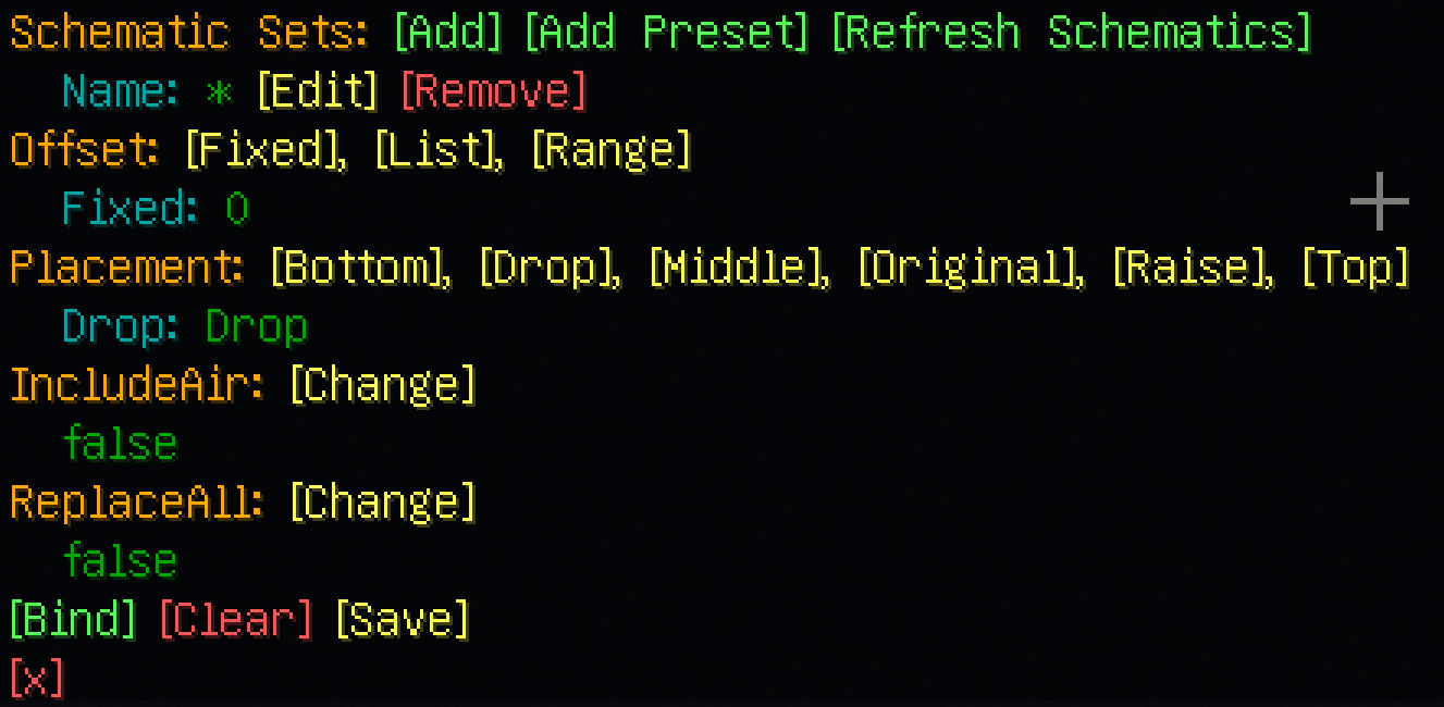 You can now save your currently used Schematic Sets as a preset via the [Save] button or use the [Bind] button to apply the brush on the tool in your hand.